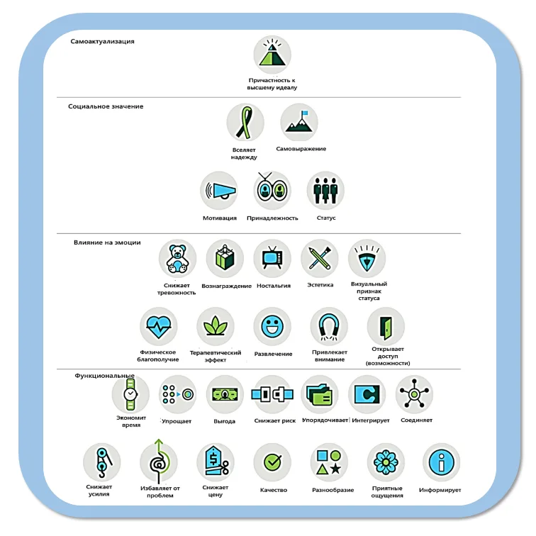 В ходе потребительских опросов были выявлены 30 элементов, влияющих на потребительские решения. При группировке этих элементов образовалась четкая структура, отражающая основные уровни пирамиды Маслоу.