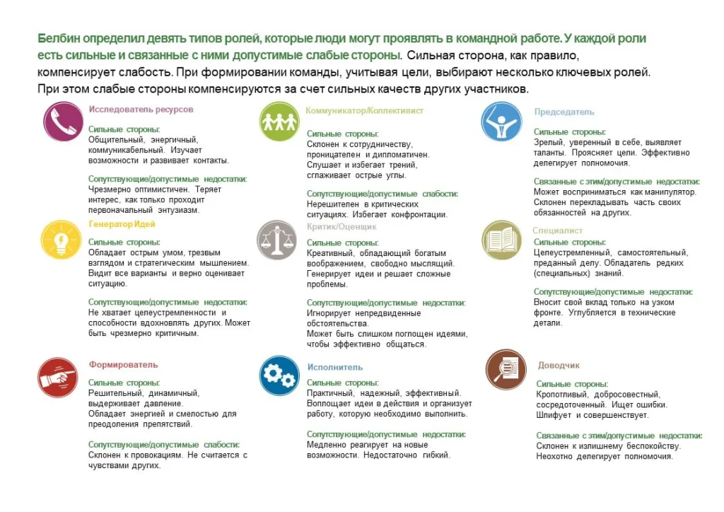 Наблюдая за взаимодействием участников деловых игр, Белбин открыл, что успешные команды состоят из людей, проявляющих в нужный момент девять поведенческих ролей. Белбин разделил их на три группы: интеллектуальные (Генератор идей, Специалист и Критик), роли действия (Формирователь, Исполнитель и Доводчик) и коммуникативные (Председатель, Коммуникатор и Исследователь ресурсов).